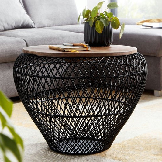 Koffietafel Metaal en Massief Mango-Hout 60x60x45 cm Salontafel Zwart | Ronde Tafel Woonkamer Moderne met Opbergruimte | Kleine Bijzettafel Woonkamertafel