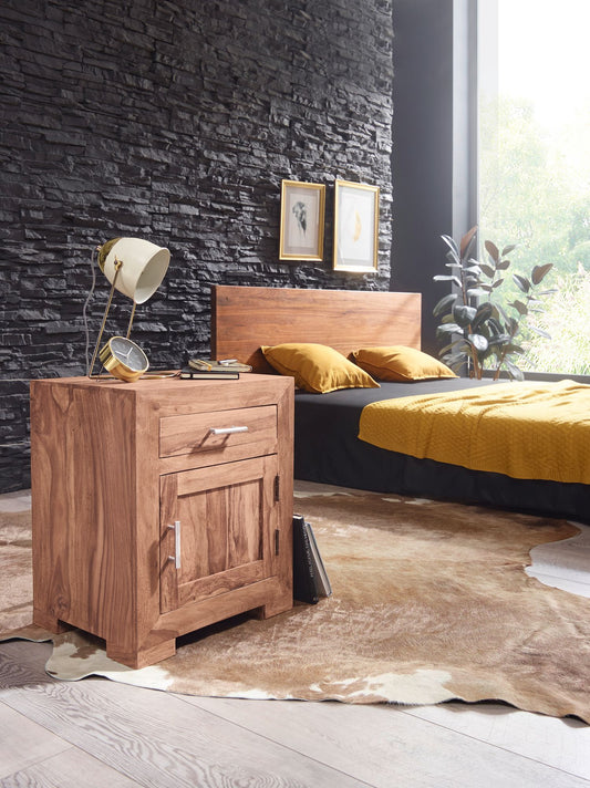 nachtkastje MUMBAI massief houten acacia design nachtkastje 60 cm met lade en deur nachtkastje voor boxspring bed