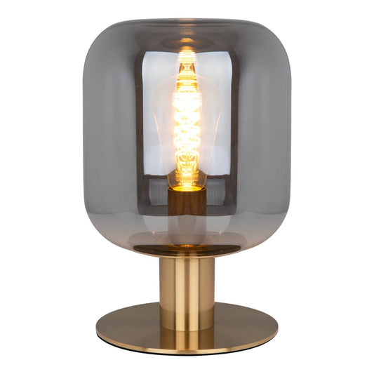 Glazen tafellicht "Alessio", 30 cm hoog, Ø 20 cm, goudkleurig metaal, rookglas, E14