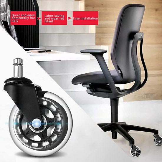 Wil jij nooit meer schade aan jouw laminaat en harde vloer of toch rijden over hoogpolig tapijt? Wil je ook nieuwe bureaustoel wielen waarbij je geruisloos en soepel door de kamer rijd? Met deze Ervesto Bureaustoel wielen kan dit allemaal. Gun jezelf het genot van stilte en een mooie vloer, zonder al die beschadigingen. Bestel deze wielen nu en geniet van meer werk confort!