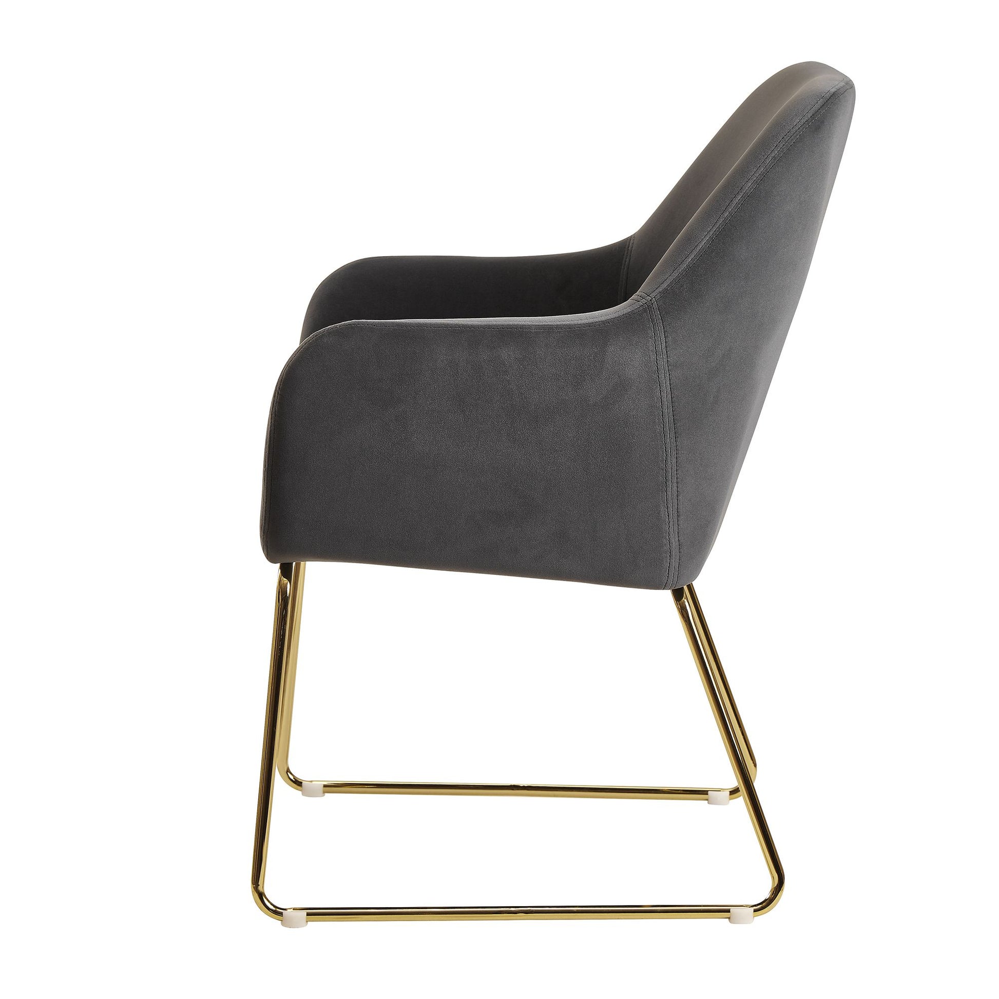 eetkamer donkergrijze fluwelen keukenstoel met gouden poten | Shell stoel stof / metaal | Design gestoffeerde eetkamerstoel | Gestoffeerde stoel