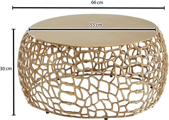 Ontwerp Uitzonderlijke salontafel in een modern design Opbergruimte biedt ruimte voor bijv. afstandsbediening, tijdschriften etc. De opvallende structuur doet denken aan takken en maakt de tafel tot een absoluut hoogtepunt Dimensie Breedte: 66 cm Diepte: 66 cm Hoogte: 30 cm Diameter tafelblad: 55 cm Dikte tafelblad: ca. 0,5 cm Kleur Volledige tafel: Goud Bijzonderheden Elke tafel is liefdevol met de hand gemaakt en is absoluut uniek Hoge stabiliteit dankzij het hoogwaardig bewerkte aluminium en de ronde vorm Door het handmatige werk kunnen er kleurafwijkingen en oneffenheden ontstaan Elke tafel heeft zijn eigen knooppatroon - geen salontafel is zoals de andere Antislipnoppen beschermen je vloer en het metaal tegen lelijke krassen Aanbevolen maximale belasting: 20 kg Materiaal Complete tafel: Gelakt aluminium Leveringsomvang Een salontafel zonder decoratie Montage Leveringstoestand: volledig gemonteerd en veilig verpakt Zorg instructies Reinig het oppervlak met een lauwwarme katoenen doek. Gebruik geen harde borstels of metalen sponzen, deze krassen op het metaal. Gebruik geen schuurmiddelen, agressieve schoonmaakmiddelen of kletsnatte doeken.