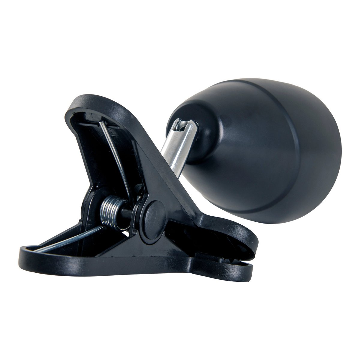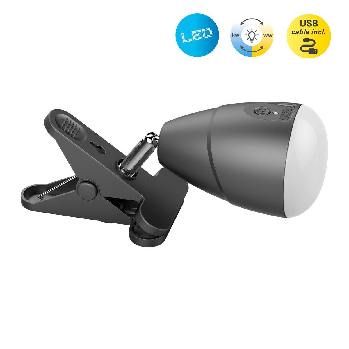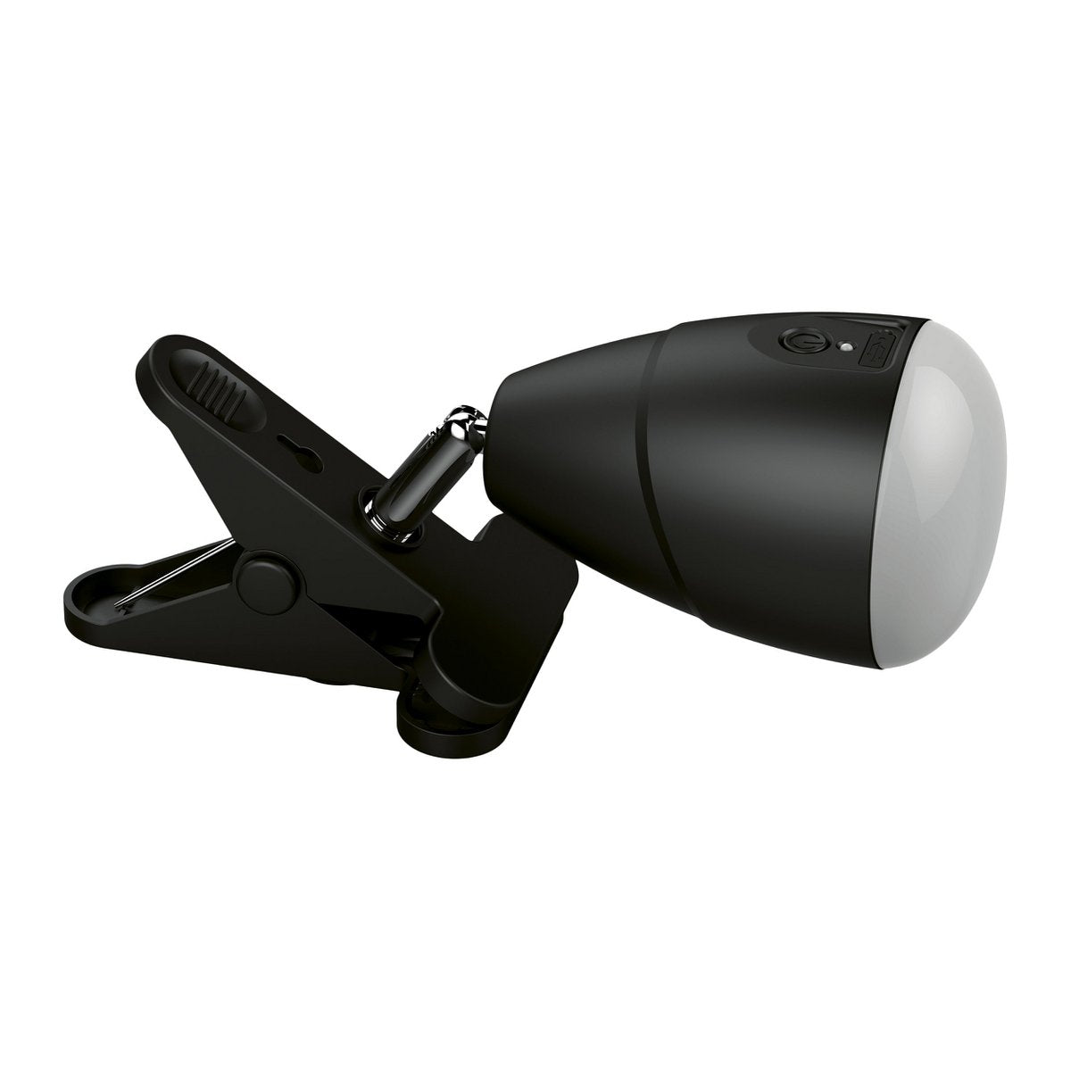 LED -klemlamp gemaakt van metaal en plastic in het zwart, met geïntegreerde LED's