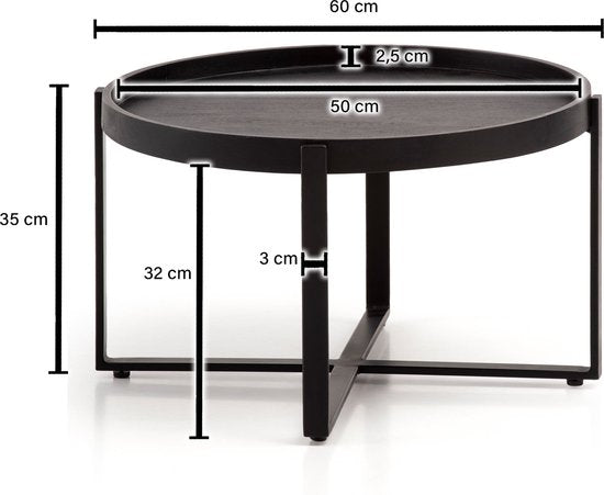 ontwerp Ronde salontafel in een trendy industrieel design Het aantrekkelijke X-frame ondersteunt het tafelblad Natuurlijke houtnerf op de plank Dimensies Breedte: 60cm Diepte: 60cm Hoogte: 35cm Diameter tafelblad: 50 cm Dikte tafelblad: 0,5 cm Metaaldikte: 1,0 cm Overige afmetingen vindt u in de maatschets Kleur Gehele salontafel: Zwart bijzonderheden Iedere tafel is met de hand gemaakt en daardoor absoluut uniek Omdat het handgemaakt en een natuurproduct is, kunnen er kleurafwijkingen of oneffenheden voorkomen Houtbescherming biedt de beschermende lakafdichting van de oppervlakken Opstaande rand rond het tafelblad beschermt voorwerpen tegen vallen Eventuele oneffenheden in de vloer kunnen worden opgevangen met behulp van de in hoogte verstelbare knoppen Het maximale draagvermogen bedraagt ca. 15 kg materiaal Tafelblad: massief mangohout (zwart geverfd, bovendien bedekt met blanke lak) Frame: gepoedercoat ijzer leveringsomvang Een salontafel zonder decoratie Montage Leveringsconditie: volledig gemonteerd en veilig verpakt Onderhoudsinstructies Reinig het oppervlak met een warme, vochtige katoenen doek. Gebruik geen schurende schoonmaakmiddelen, agressieve schoonmaakmiddelen of druipnatte doeken.