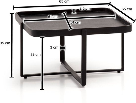 ontwerp Vierkante salontafel in een trendy industrieel design Het aantrekkelijke X-frame ondersteunt het tafelblad Natuurlijke houtnerf op de plank Tafelbladrand met afgeronde hoeken Dimensies Breedte: 65cm Diepte: 65cm Hoogte: 35cm Tafelblad (BxD): 61 x 61 cm Dikte tafelblad: 0,5 cm Metaaldikte: 1,0 cm Overige afmetingen vindt u in de maatschets Kleur Gehele salontafel: Zwart bijzonderheden Iedere tafel is met de hand gemaakt en daardoor absoluut uniek Omdat het handgemaakt en een natuurproduct is, kunnen er kleurafwijkingen of oneffenheden voorkomen Houtbescherming biedt de beschermende lakafdichting van de oppervlakken Opstaande rand rond het tafelblad beschermt voorwerpen tegen vallen Eventuele oneffenheden in de vloer kunnen worden opgevangen met behulp van de in hoogte verstelbare knoppen Het maximale draagvermogen bedraagt ca. 15 kg materiaal Tafelblad: massief mangohout (zwart geverfd, bovendien bedekt met blanke lak) Frame: gepoedercoat ijzer leveringsomvang Een salontafel zonder decoratie Montage Leveringsconditie: volledig gemonteerd en veilig verpakt Onderhoudsinstructies Reinig het oppervlak met een warme, vochtige katoenen doek. Gebruik geen schurende schoonmaakmiddelen, agressieve schoonmaakmiddelen of druipnatte doeken.