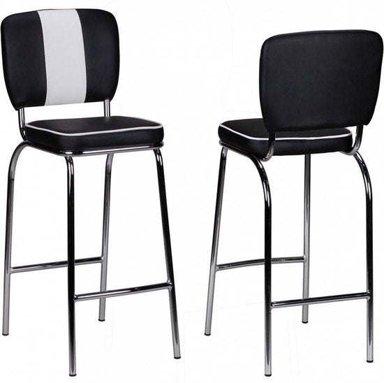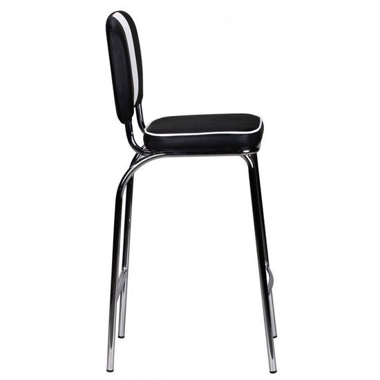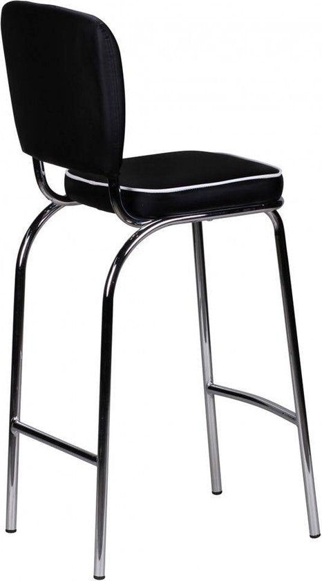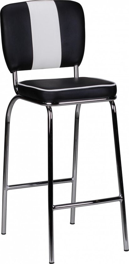 De rugleuning van elke variant is van kunstleer en voorzien van een brede witte baan. De zitting is afgewerkt met een subtiel wit randje en de chromen stoelpoten glimmen je tegemoet. Een aantal van deze retro barstoelen passen perfect bij een bartafel uit de Elvis serie!